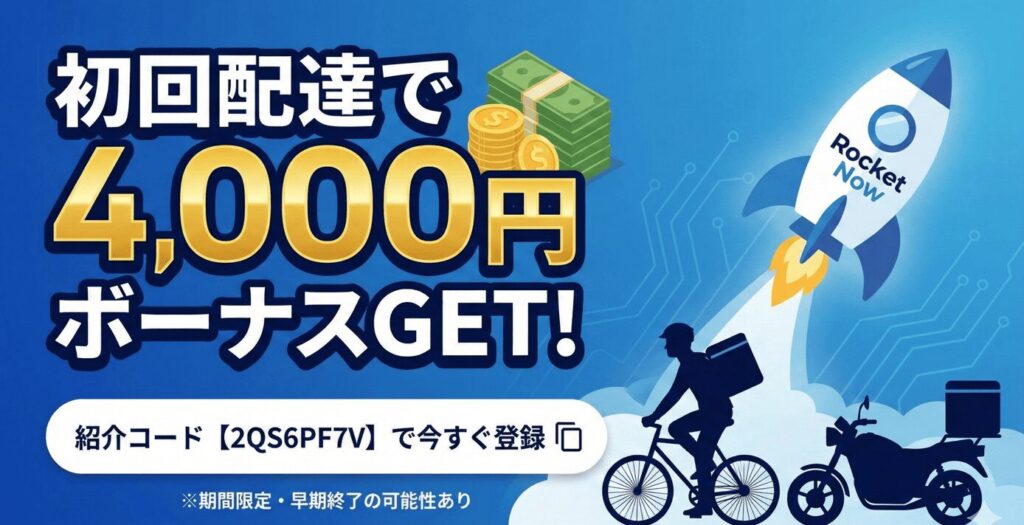 ロケットナウは、AI技術を駆使した「超・効率重視」のデリバリーアプリ。 最大の特徴は、「紹介コードを使って登録し、初回配達を完了するだけで4,000円がもらえる」というシンプルかつ強力なキャンペーンです。【当サイト限定キャンペーン】 このLPで公開している招待コードを入力して登録するだけで、通常の報酬に加えてボーナスが確定します。