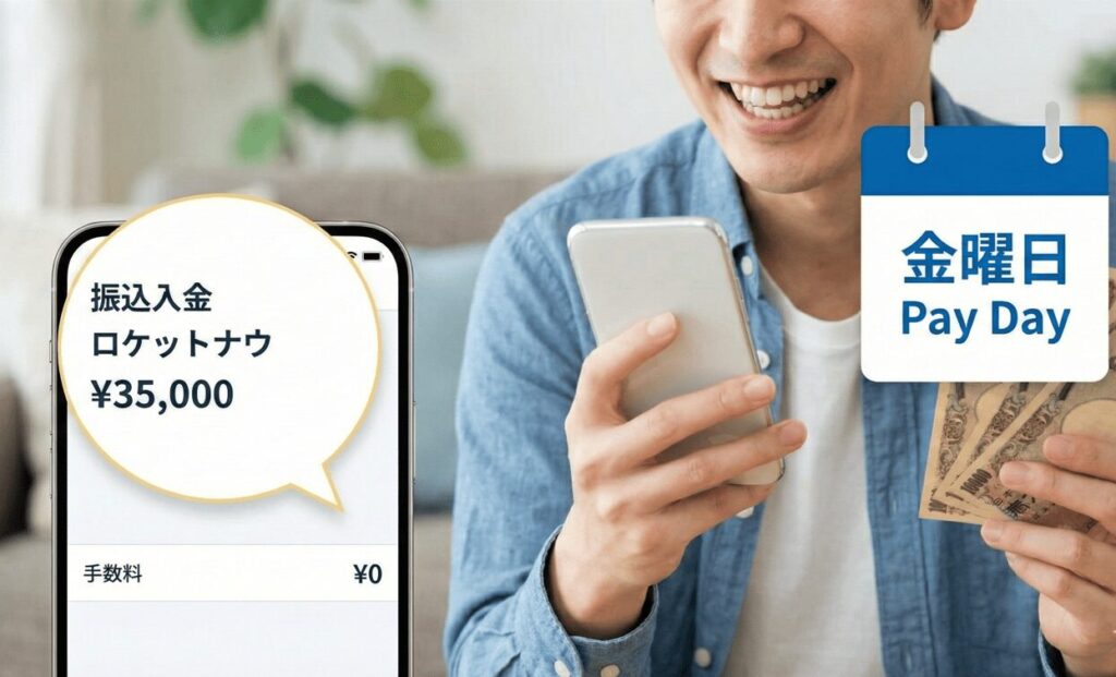 「今の生活費がピンチ」という時も安心してください。ロケットナウは毎週火曜日締め、その週の金曜日払い。しかも振込手数料は完全無料です。他社のように「2週間後」や「手数料がかかる即時払い」に悩む必要はありません。稼いだ額がそのまま、週末にはあなたの口座に着金します。