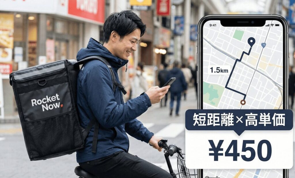 ロケットナウのAIは、配達員に無理な長距離移動をさせません。平均配達距離は約2km〜3kmと短め。それなのに、基本報酬は他社競合よりも高水準(450円〜など)に設定されています。「え、こんなに近いのにこの金額?」と驚くことでしょう。無駄な体力を温存しながら、効率よく件数を稼げます